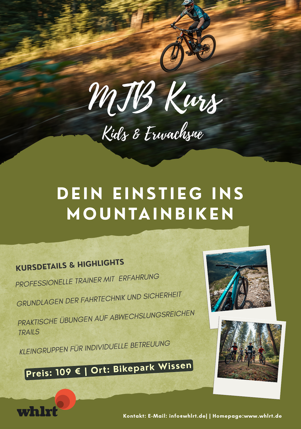 Erlebe ein sicheres und spaßorientiertes Techniktraining im Bikepark Wissen – für Kinder und Erwachsene gleichermaßen! In einem 4-stündigen Workshop von 09:30 bis 13:30 Uhr verbessern Einsteiger*innen und Fortgeschrittene ihre Fahrtechnik Schritt für Schritt. Auf abwechslungsreichen Trails lernen die Teilnehmenden wichtige Grundlagen wie die richtige Körperposition, Kurven- und Bremstechnik sowie das sichere Überfahren von Wellen und kleinen Hindernissen. Dank individueller Betreuung durch erfahrene Coaches wird das Training optimal an das jeweilige Fahrkönnen angepasst und ermöglicht eine gezielte Weiterentwicklung. Voraussetzung sind ein eigenes Mountainbike, ein Helm (Pflicht) sowie selbst mitgebrachte Verpflegung.